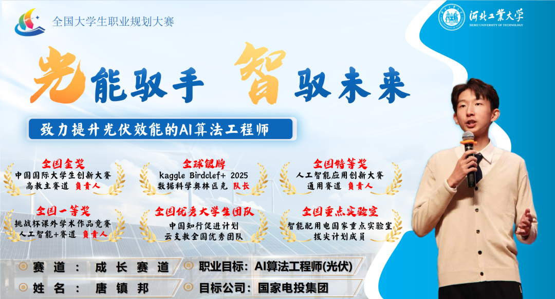 在成长赛道高教组中,唐镇邦同学凭借清晰的职业目标、系统的成长路径规划以及扎实的实践成果,展示了优秀的综合素质和专业能力,赢得评委高度认可,最终斩获全国金奖。