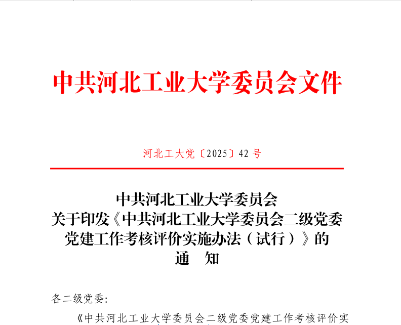 压实党组织主体责任和书记第一责任人职责。制定《中共河北工业大学委员会二级党委党建工作考核评价实施办法(试行)》等制度文件。开展2轮学院党委会和党政联席会议事规则修订工作,对17个学院党委的落实情况开展多次专项督查;