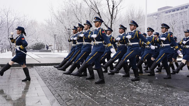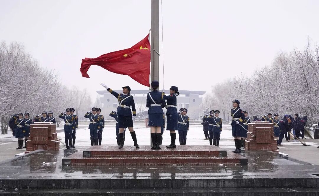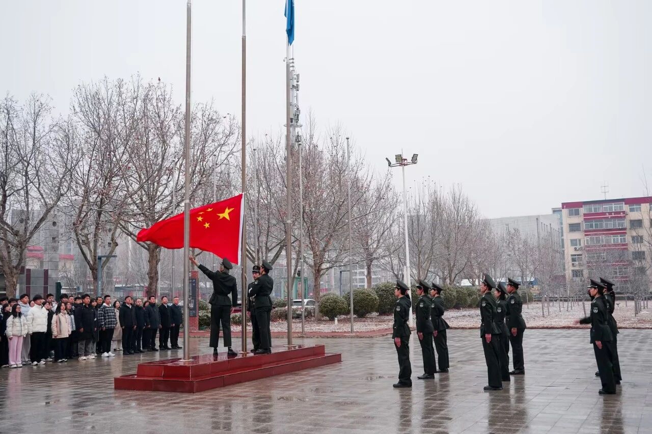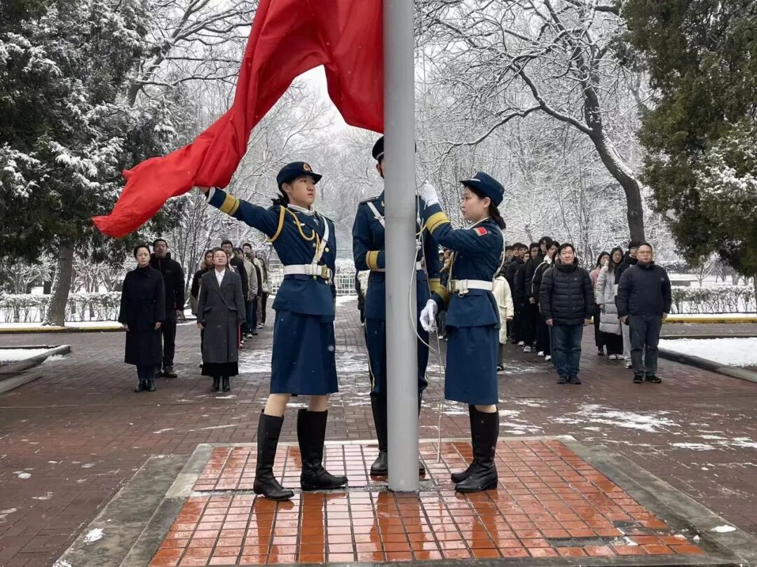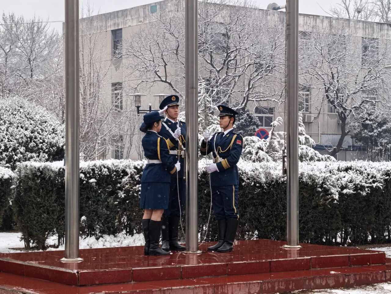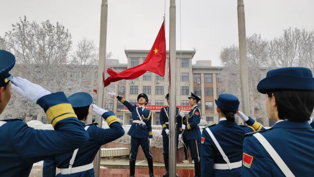上午8时,学校在北辰校区、红桥校区、廊坊校区三地同步举行2026年春季学期首次升国旗仪式。校领导、中层干部、专任教师、管理服务人员、辅导员及学生代表齐聚操场,在瑞雪纷飞、清景无限的清晨,共同见证庄严时刻。