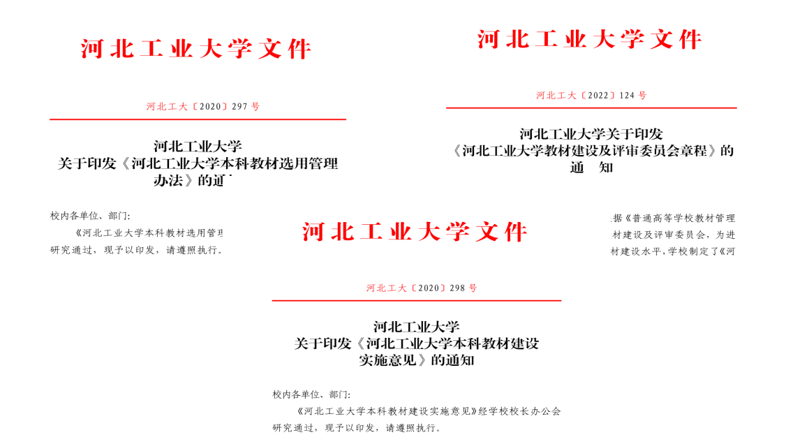 健全制度夯基础。出台《河北工业大学本科教材建设实施意见》等系列文件,严格规范教材编写、选用与管理;落实规范化教材保障机制,严格遵循教材“凡编必审”“凡选必审”原则,落实院校两级审核公示备案制度,筑牢质量防线,夯实教材育人基础。