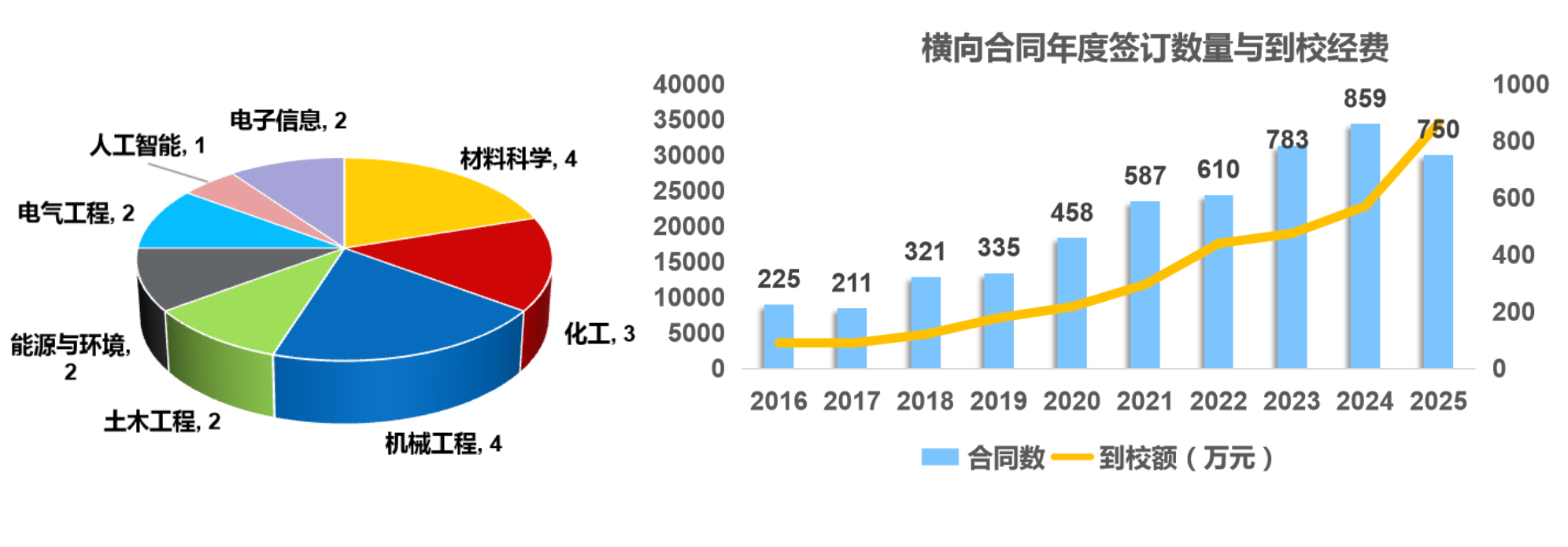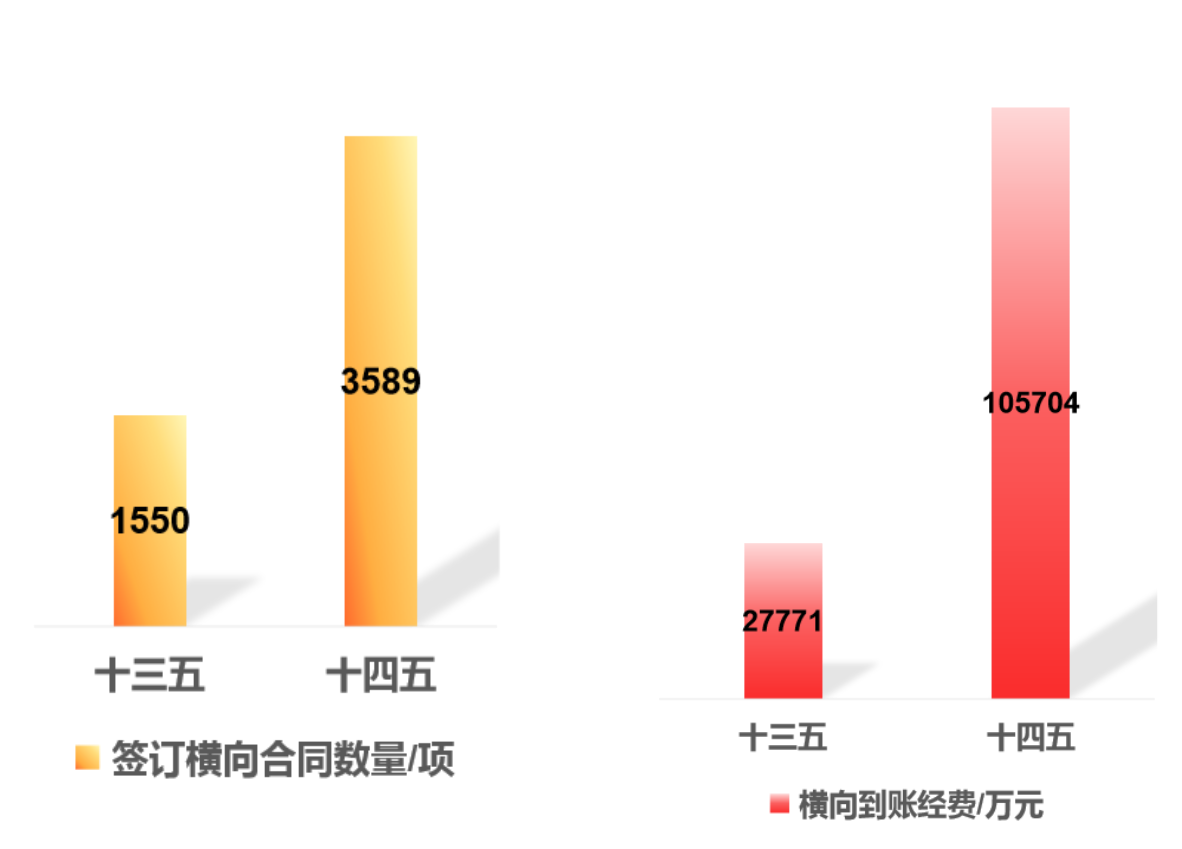 截至2025年11月30日,学校五年来累计签订横向合同3500多项,其中签订千万级成果转化项目20项。“十四五”期间,签订合同数量较“十三五”增长123%;横向到账经费金额增长280.63%,服务国家和区域经济建设能力显著增强。2025年8月,“振捣机器人”等3项专利赋权给成果完成人,并以250万元作价入股企业,实现学校首例职务科技成果赋权转化。