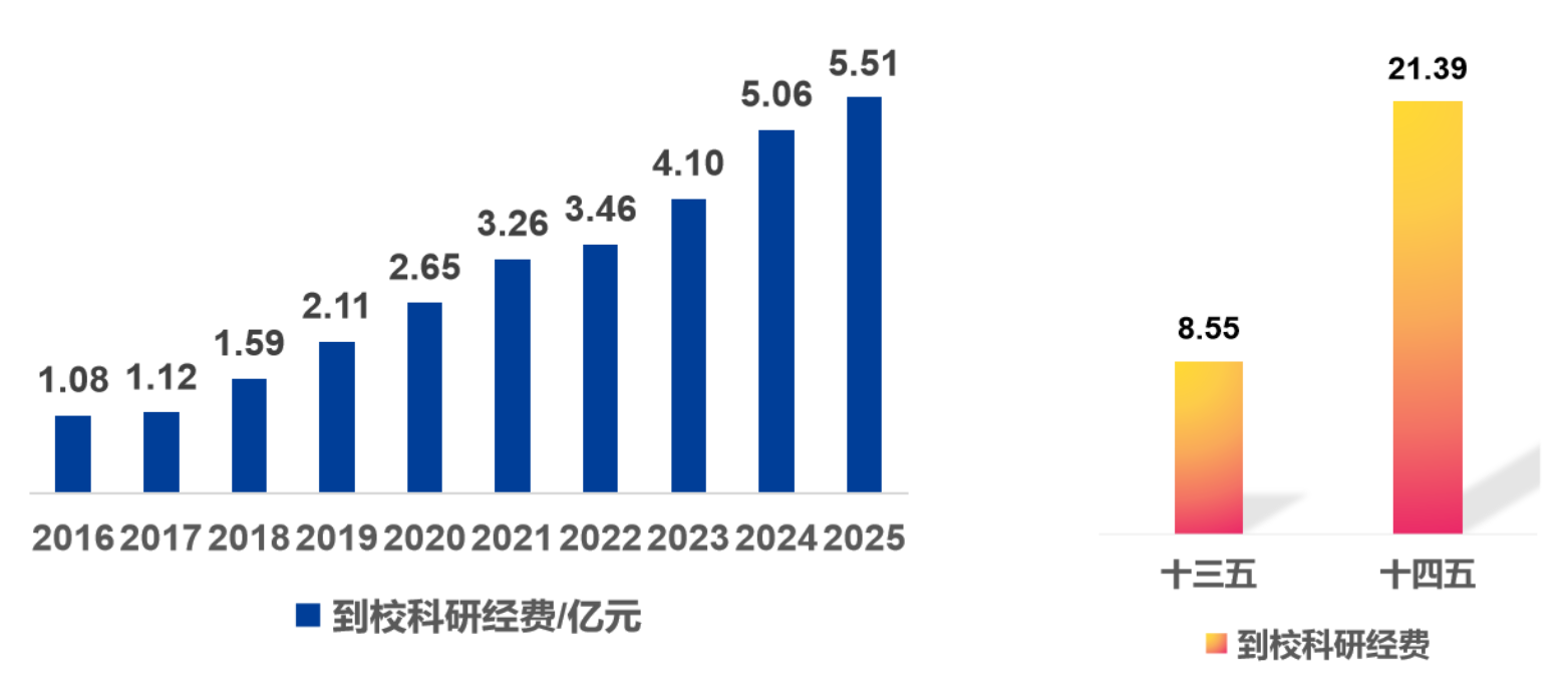 到校经费稳定攀升。推进学术交流,促进校政企合作,创新氛围持续加深,科研环境进一步深化,到校科研经费实现稳定增长,2021年突破3亿元、2023年突破4亿元、2024年突破5亿元,2025年预计再创新高。