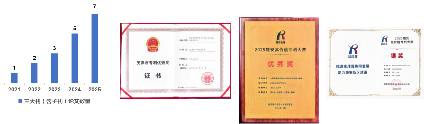 科技奖励硕果累累。“十四五”以来,学校获省级以上科技奖励96项,其中突出贡献奖1项、一等奖22项、二等奖51项,合作奖1项。2022、2023年度获得河北省科技奖励一等奖大满贯,2024年度摘得河北省科技奖励一等奖4项,获得单年度奖励突破。“十四五”期间学校获得的省部级奖励数量、牵头获得省部级奖励数量、牵头获得的省部级一等奖以上奖励数量,相较“十三五”分别提升45%、20%、25%。高性能机器人触觉传感智能系统入选2020年“科创中国”先导技术榜单;立面维护机器人入选2023中国智能制造十大科技进展和2023年“科创中国”先导技术榜单;光伏组件可靠性检测视觉大模型应用场景入选2024年京津冀共建共享十大场景。