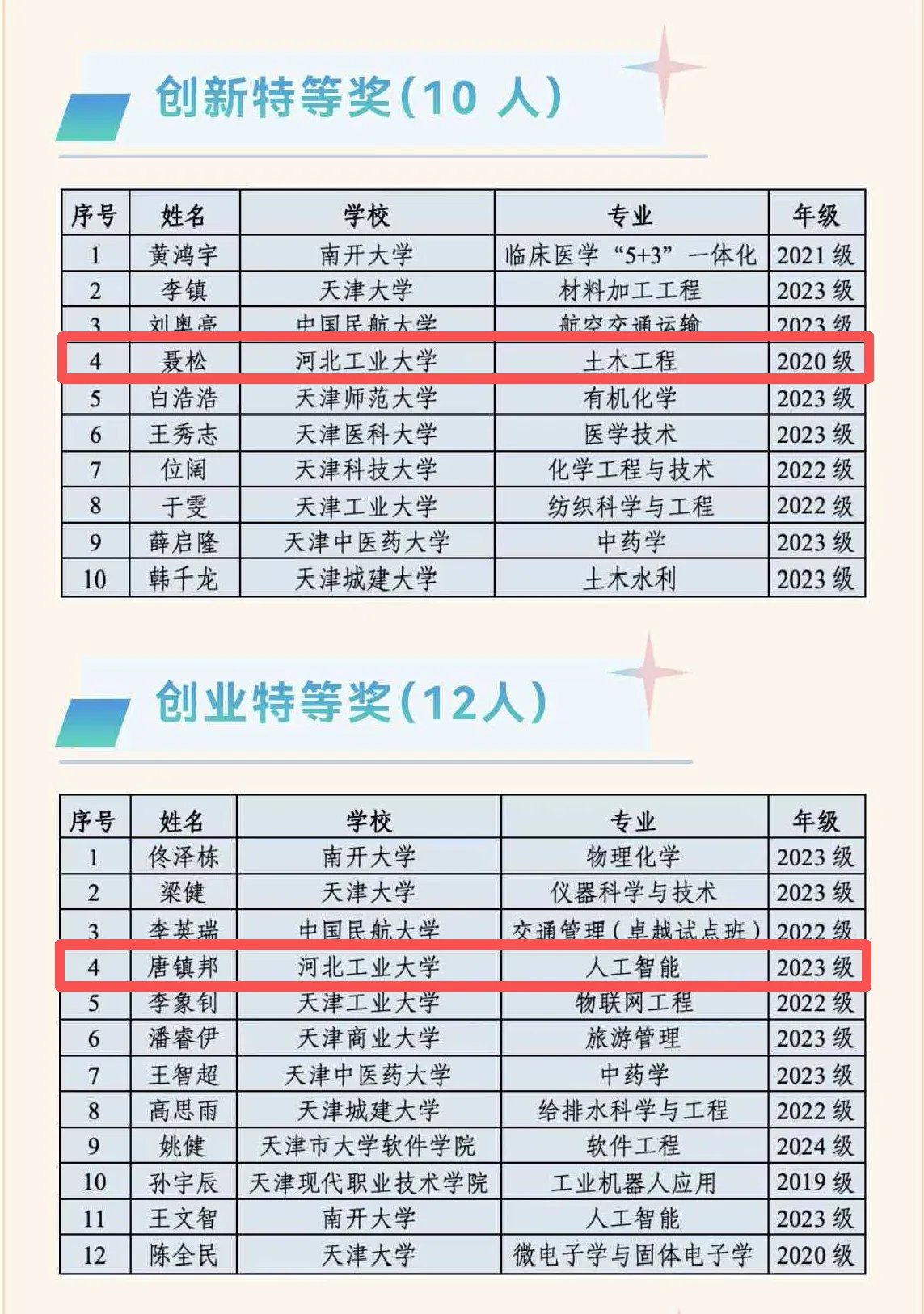 近日,天津市教育发展基金会正式公布2025年天津市大学生创新创业奖学金获奖名单。河北工业大学共有10名学子荣登榜单,其中聂松同学摘得“创新特等奖”,唐振邦同学斩获“创业特等奖”。这是继2023年之后,河北工业大学再次同时将创新与创业两项特等奖收入囊中,充分彰显了学校深化创新创业教育改革、厚植创新人才沃土的突出成效。