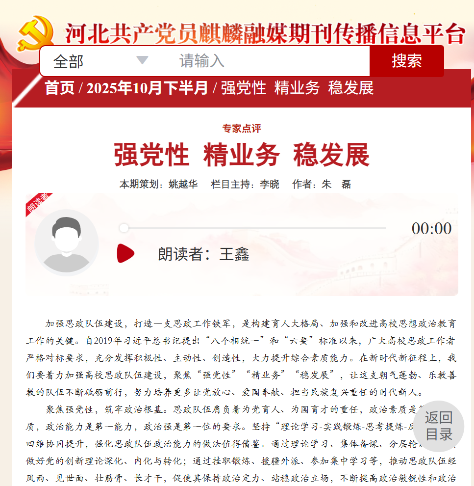 2025 年 10 月,《共产党员》杂志报道了我校在思政队伍建设方面的实践成果。我校通过聚焦“强党性、精业务、稳发展”,着力提升思政队伍的政治素质、专业素养和保障支持,打造了一支高素质的思政工作铁军,为培养担当民族复兴大任的时代新人提供了坚实支撑。
