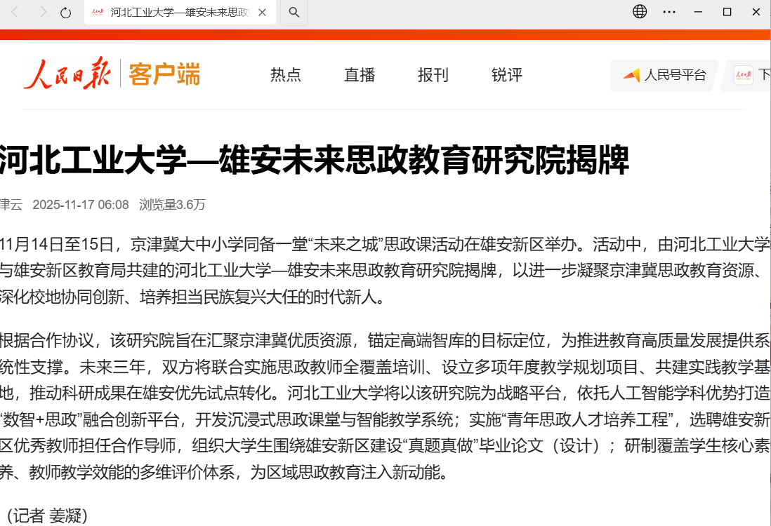 2025年11月17日,人民日报客户端报道我校雄安未来思政教育研究院揭牌。活动中,由我校与雄安新区教育局共建的河北工业大学—雄安未来思政教育研究院正式揭牌,进一步凝聚京津冀思政教育资源、深化校地协同创新、培养担当民族复兴大任的时代新人。